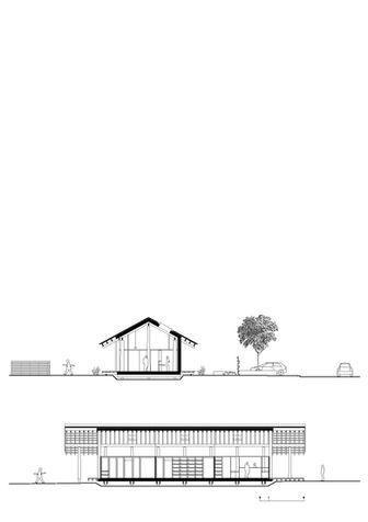 Le projet prend la forme d'un grand toit à double pente qui protège l'ensemble du programme, où tous les espaces servants sont regroupés au Nord.